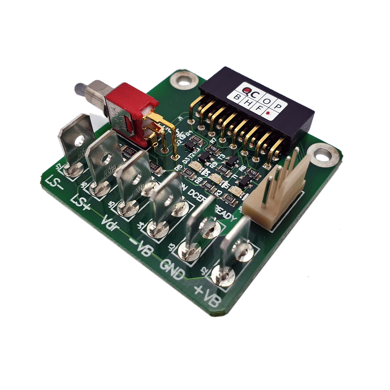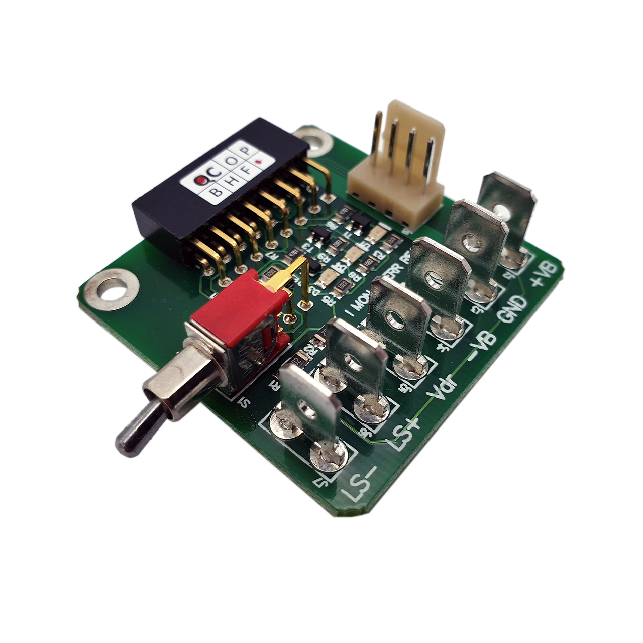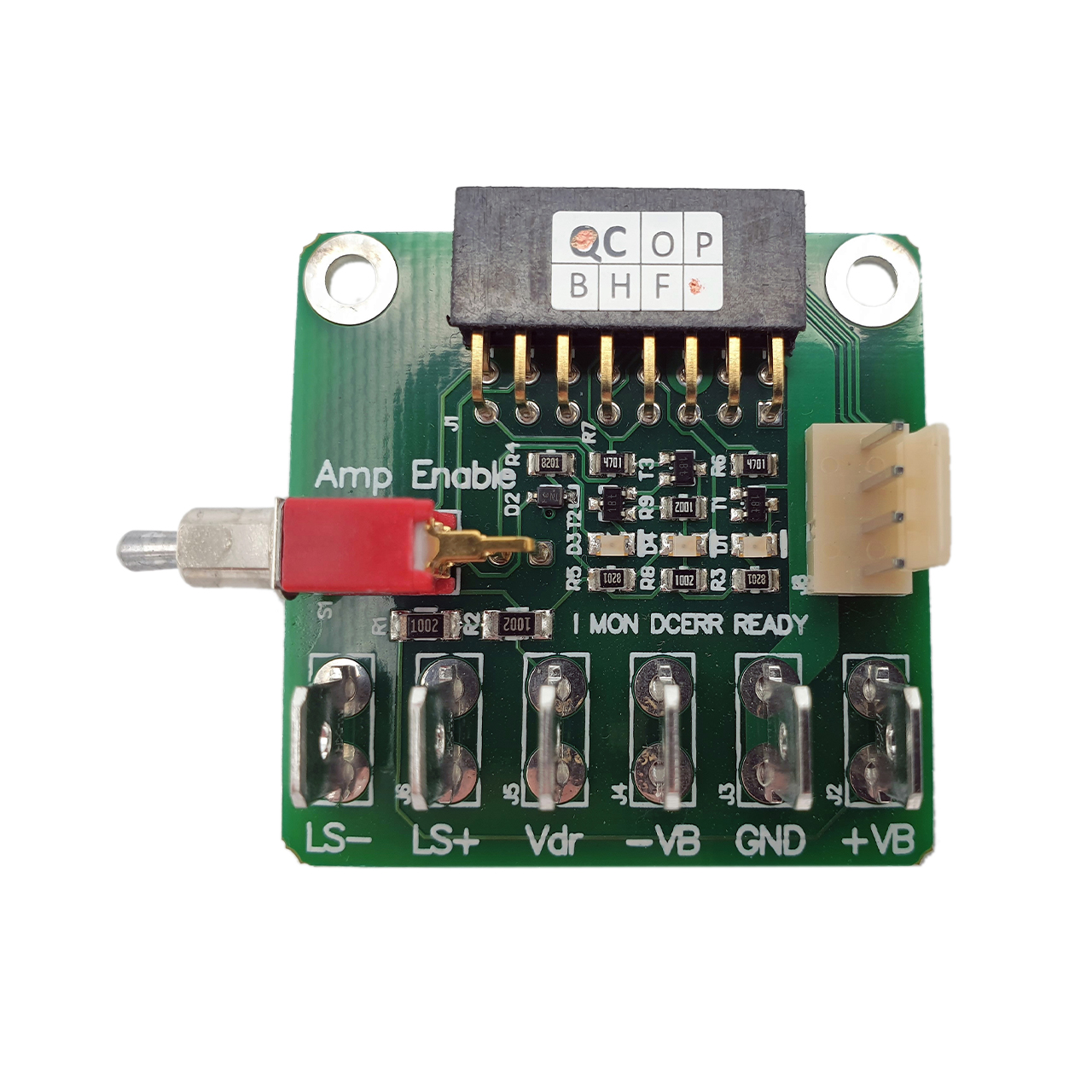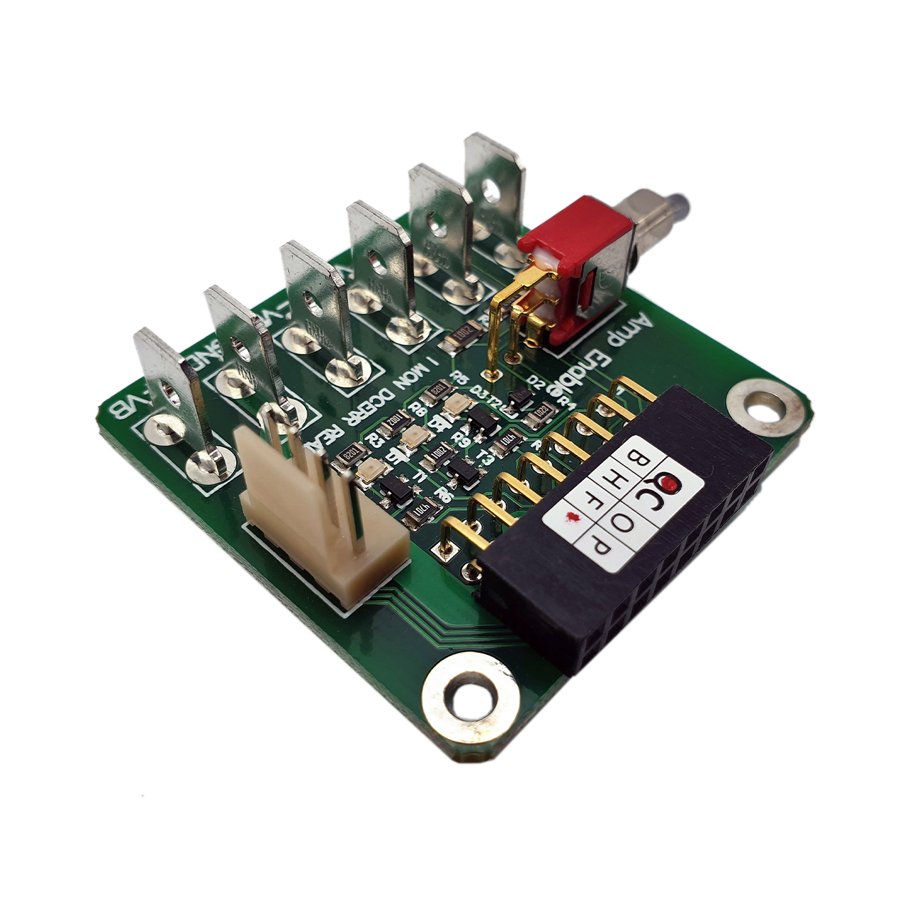 This board alows you to connect the UcD180LP OEM, UcD250LP OEM or the UcD400LP OEM with FASTON connectors and our signal cable. This board is an excelent product for all sample users to make a quick setup for testing.